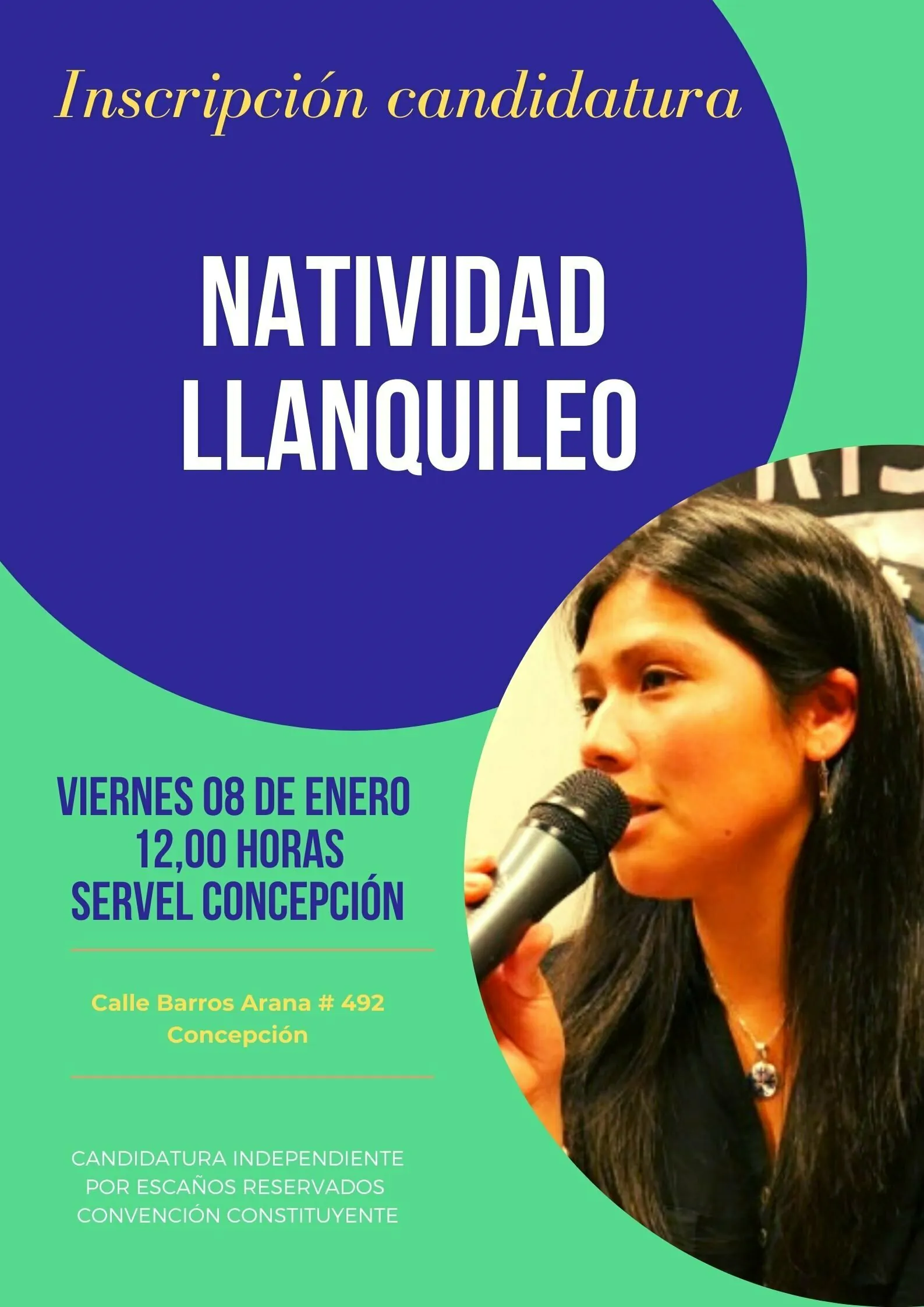 Desde la Plataforma que ha promovido la candidatura de Natividad Llanquileo a la Constituyente, se ha señalado: «Tenemos la alegría de comunicar, que este viernes se realizará la Inscripción de la Candidatura de nuestra lamngen Natividad Llanquileo Pilquimán Constituyente. Viernes 8 a las 12 horas, en el Servel de CONCEPCIÓN, ubicado en Barros Arana 492».