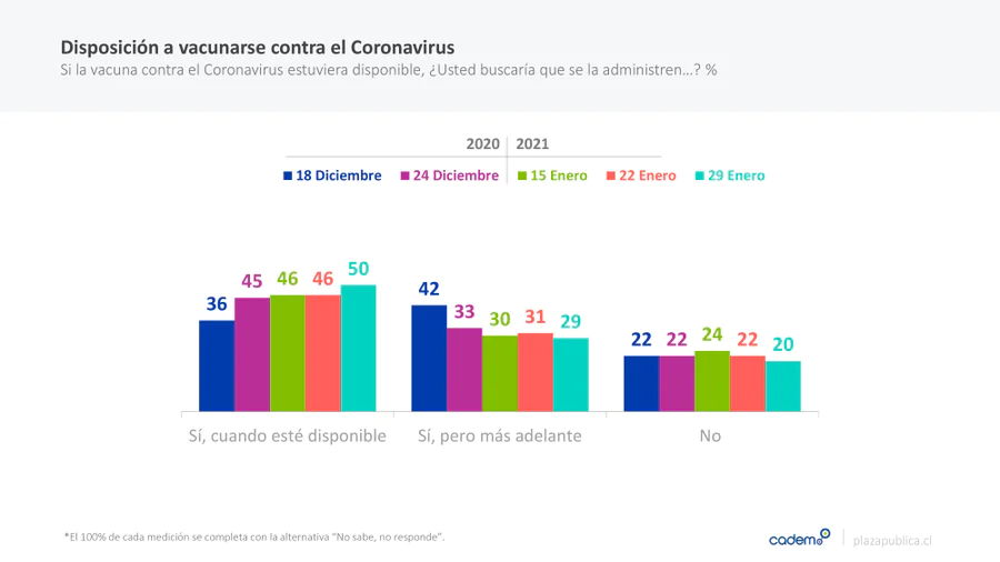 La principal razón (76%) para declarar que esperarían para más adelante es tener la seguridad de que la vacuna funciona y no tiene contraindicaciones, mientras que las razones para no vacunarse son miedo a que la vacuna tenga consecuencias extrañas (39%) y desconfianza en las vacunas nuevas (33%).
