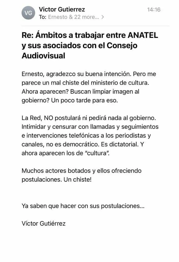 La dura carta del Director Ejecutivo de La Red, Víctor Gutiérrez, contestando la invitación que hizo el Gobierno a los canales de TV chilenos