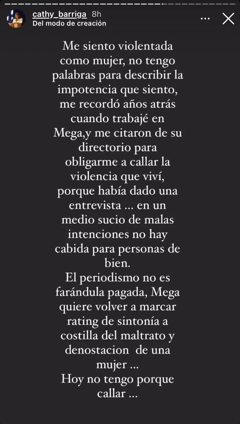 “Me recordó años atrás cuando trabajé en Mega y me citaron de su directorio para obligarme a callar la violencia que viví, porque había dado una entrevista… en un medio sucio de malas intenciones no hay cabida para personas de bien”, añadió.