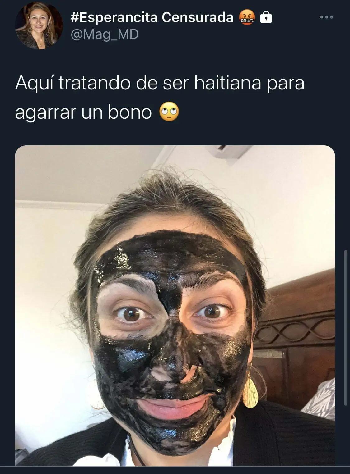 “Aquí tratando de ser haitiana para agarrar un bono”, compartió la anestesista Magaly Obregón Ampuero, adjuntando además una foto con su rostro cubierto con una máscara facial de carbón.