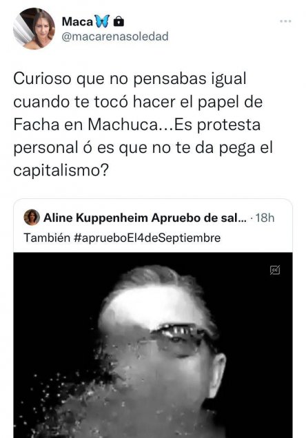 «Curioso que no pensabas igual cuando te tocó hacer el papel de facha en ‘Machuca’ ¿Es protesta personal o es que no te da pega el capitalismo?», fue la increíble respuesta de la usuaria llamada Maca a Kuppenheim.
